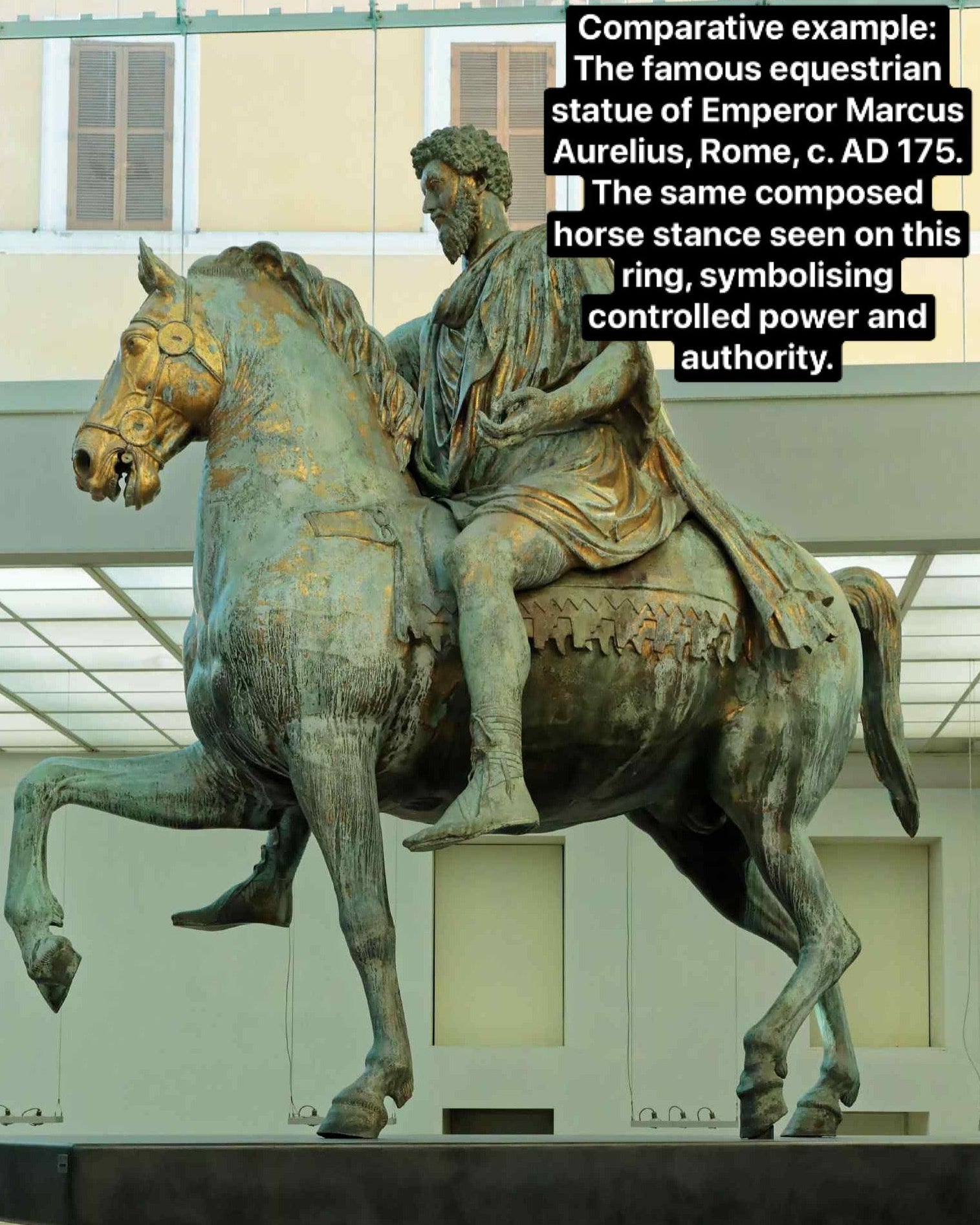 The horse-and-rider motif seen on this Roman bronze seal ring echoes a visual language used across Roman imperial art, most famously in the surviving equestrian statue of Emperor Marcus Aurelius c.175 A.D (please see image 5 for comparison). The horse’s pose — one leg raised, the other firmly grounded — was a deliberate compositional choice, symbolising controlled motion, authority, and restraint rather than aggression.
