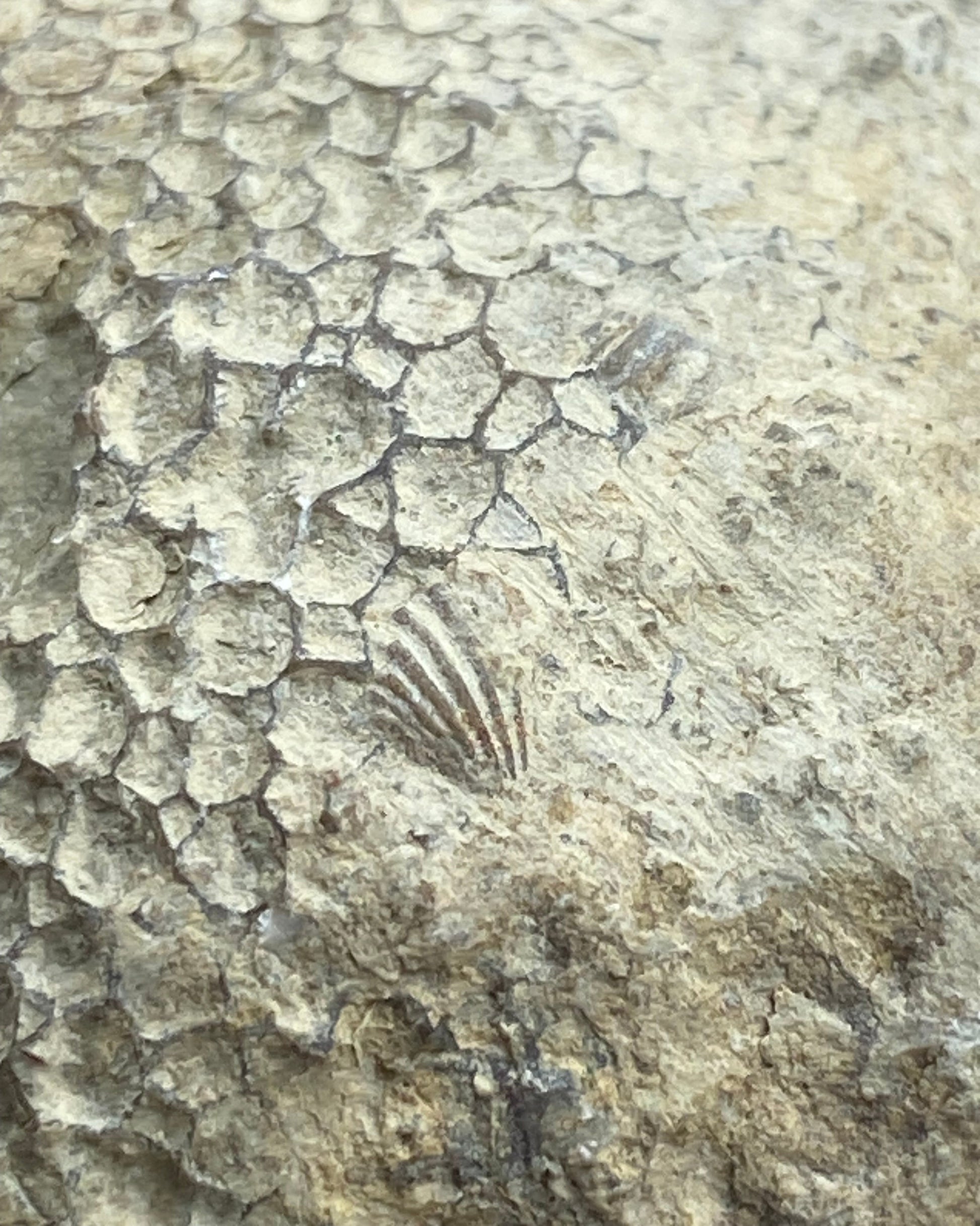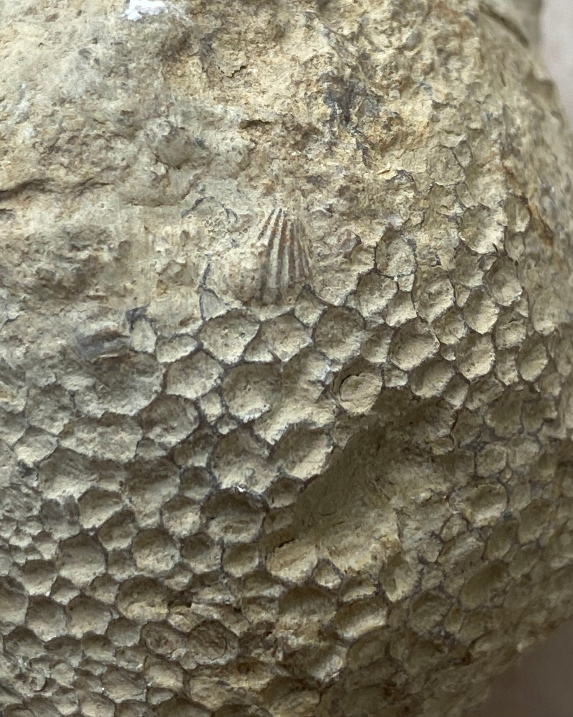 Preservation: Clear honeycomb coral structure. Stable with no restoration.