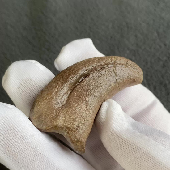 Anatomically, this claw represents a robust partially weight bearing pedal ungual from the left foot of a small to medium-sized eusauropod. Its recurved and sturdy form reflects adaptations for supporting substantial body mass while maintaining stability and mobility across varied terrain. The claw exhibits a subtle inward curve toward the body’s midline, curving to the right, which identifies it as originating from the left foot. In sauropods, pedal unguals naturally curve toward the center of the body, allowing paleontologists to determine laterality even from isolated claws.